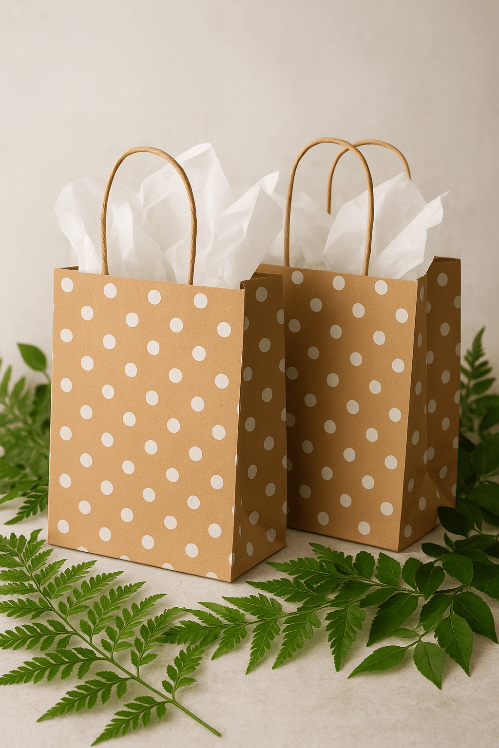 The bags were simple but sweet — brown paper with white handles and polka dots. Inside each one, we carefully wrapped a long-sleeved white onesie around the digital test and tucked in a few tiny pacifiers. It was such a small gesture, but it carried the biggest secret of our lives — a new heartbeat, a new beginning, and the start of our journey into parenthood.